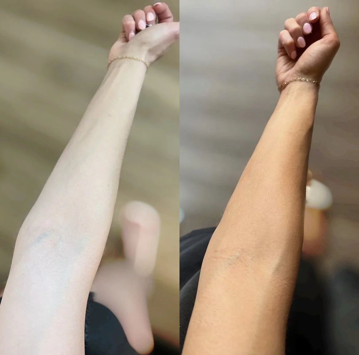 The Basic tan is a 6-8 hour rinse time. I come to you and set up with my pop up tent, spray you, and dry you. Start to finish takes about 20 minutes and this tan lasts 8-10 days.